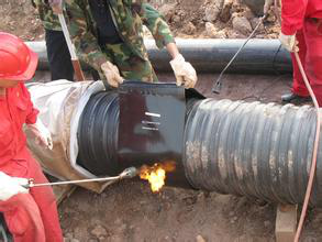 4、將熱收縮套移至接頭處居中位置,取出隔離材料。從中間沿圓周方向均勻加熱,使其完全收縮后再分別向兩端延伸加熱。加熱時熱縮套允許受熱溫度不得超過250℃,注意用火均勻。待全部收縮完后,再重新加熱表面凹凸不平的地方,使其完全平整。整體加熱完畢后,調小火焰再重新加熱一遍,以使熱熔膠充分溢出。加熱過程中用壓輥將接頭輾壓幾遍,重點輾壓熔合搭接處,以排除氣泡。